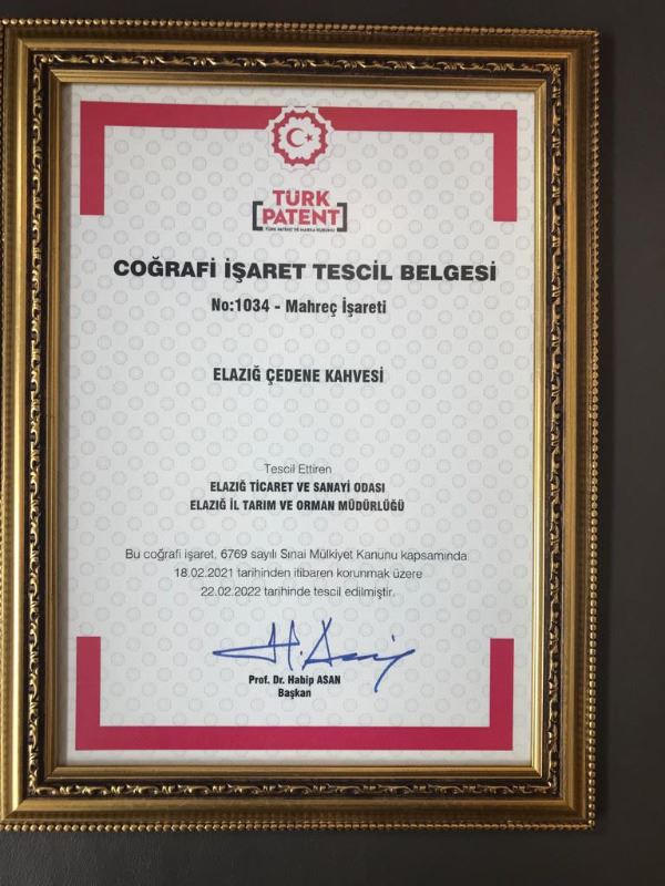 Elazığ Çedene Kahvesi Coğrafi Tescil Belgesi için Türk Patent ve Marka Kurumundaki belge törenine Elazığ TSO Başkanı Asilhan Arslan, Meclis Başkan Vekili Veli Aksu, Genel Sekreter M.Mehmet Karabulut, Basın Halkla İlişkiler Müdürü ve Coğrafi İşaretler Çalışma Komisyonu Sekreteri Etem Yalın katıldı. Belge TPMK Başkan Yrd. Dr. Mehmet Duyar tarafından takdim edildi. Elazığ TSO Yönetim Kurulu Başkanı Asilhan Arslan belge töreninde yaptığı değerlendirmede Elazığ adına çok önemli bir ürünün Coğrafi Tescil Belgesini almış olmaktan çok büyük bir mutluluk duyduğunu belirterek, “Odamız bünyesinde hizmet veren ve aralarında İl Tarım ve Orman Müdürlüğümüz, Üniversitemiz, Medya kuruluşlarımız, Fırat Kalkınma Ajansımız ve Odamız Profesyonellerinin bulunduğu ekibimiz tarafından çok önemli çalışmalar yapılmaktadır. Çalışma Komisyonumuz son bir yıl içerisinde gerçekten hem bugün hem de gelecekte çok daha önemli bir ticari ürün olacak olan Menceki Buğdayı ve Elazığ Çedene Kahvesi Coğrafi Tescil Belgelerini ilimize kazandırmıştır. Komisyonumuz ilimiz için değer ifade eden ürünlerle ilgili aynı kararlılıkla çalışmalarını devam ettirmektedirler. Oda olarak özellikle tarımsal ve hayvansal ürünlerimizin çok daha yüksek katma değere dönüşmesi ve ilimiz ekonomisine değer üretmesi hem de yoğun istihdam ile işsizlik sorununa çözüm üretilmesi hedeflenmektedir. Tarımsal tüm süreçlerin ve aynı zamanda üretim süreçlerinin de profesyonelce yönetilmesi için kooperatif, birlik ve yüklenici şirketlerimizi kurmuş durumdayız. Çok yönlü olarak yürütülen bu çalışmalarda bir yandan tarladan üretim bandına kadar olan süreçlerin yönetilmesi planlanırken diğer yandan da İlimizin bu önemli değerlerinin tescillerinin yapılmasına gayret gösteriyoruz. Elazığ kamuoyunun da ısrarla Çedene Kahvesinin tescilinin Elazığ’da olması yönünde bir talepleri ve beklentileri olmuştu bu beklentinin karşılanmış olması da ayrı bir mutluluk kaynağı olmuştur. Çedene Kahvesi üreten firmalarımızın Odamızla iletişim halinde olarak Coğrafi İşaretli Ürün logosu ile bu ürünü paketlemeleri ürüne değer katacak ve ilgili kanun gereğince zincir marketlere dahi verebilecektir. Şehrimizin çok önemli bir değeri olan Elazığ Çenede Kahvesini ilimize kazandıran ekibimize ve Türk Patent ve Marka Kurumumuza gösterdikleri hassasiyet ve hızlı çözüm süreci için teşekkür ediyor, hayırlı olmasını temenni ediyorum” ifadelerinde bulundu.