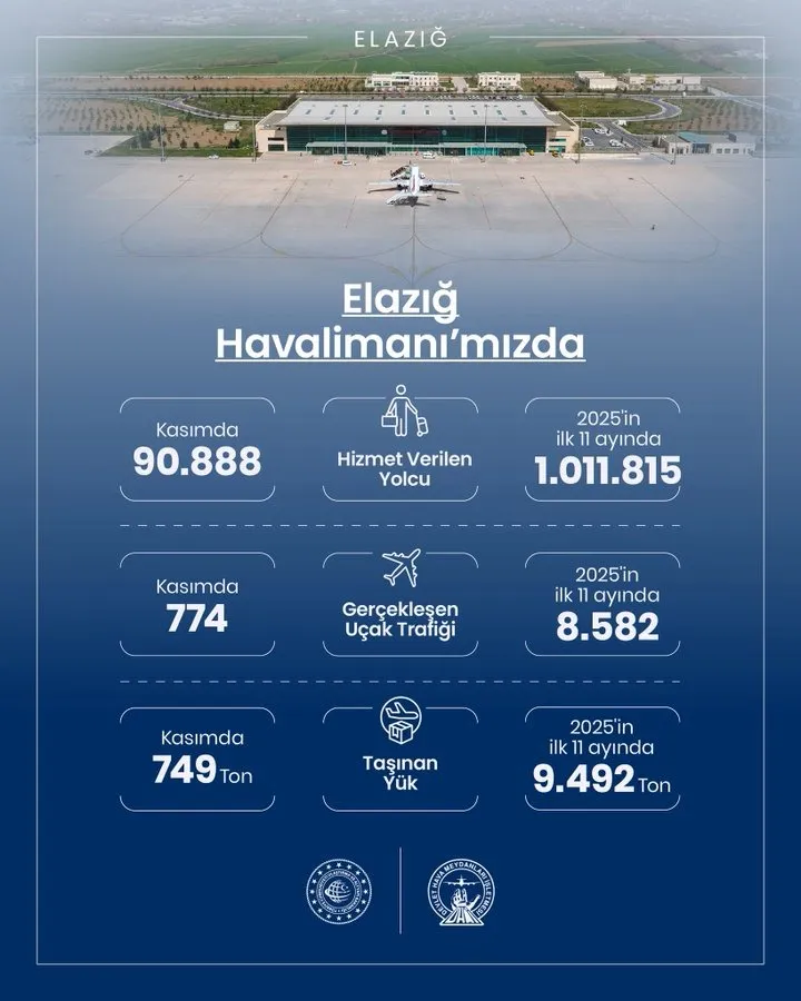 ELAZIĞ (AYIŞIĞI) Elazığ Havalimanı, 2025 yılı Kasım ayına ilişkin yolcu, uçak ve yük trafiği verilerini açıkladı.