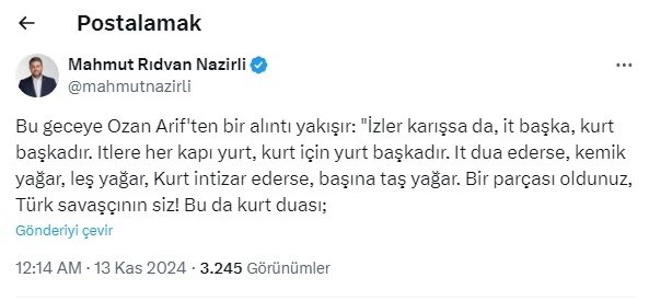 Nazırlı, Türk dünyasının simge isimlerinden Ozan Arif’in dizelerinden alıntı yaparak, “İzler karışsa da, it başka, kurt başkadır. İtlere her kapı yurt, kurt için yurt başkadır. İt dua ederse, kemik yağar, leş yağar, kurt intizar ederse, başına taş yağar.” ifadelerini kullandı. “Bir parçası oldunuz, Türk savaşçının siz! Bu da kurt duası.” sözleriyle gönderisini tamamlayan Nazırlı, sosyal medyada büyük yankı uyandırdı.