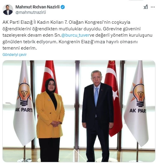 AK Parti Elazığ Milletvekili, TBMM Dışişleri Komisyonu Üyesi, TÜRKPA Grubu Üyesi ve EKVATOR Dostluk Grubu Kurucular Kurulu Başkanı Mahmut Rıdvan Nazırlı, AK Parti Elazığ İl Kadın Kolları 7. Olağan Kongresi ile ilgili sosyal medya hesabından bir açıklama yaptı.