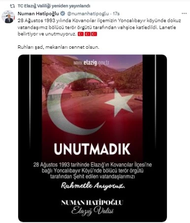 Elazığ Valisi Numan Hatipoğlu, 28 Ağustos 1993 tarihinde Kovancılar ilçesine bağlı Yoncalıbayır köyünde bölücü terör örgütü tarafından şehit edilen dokuz vatandaşımızı anarak, derin bir üzüntü ve saygı mesajı yayımladı. Vali Hatipoğlu, bu trajik olayın yıldönümünde, hayatlarını kaybeden vatandaşları lanetleyerek, unutulmadıklarını ve her zaman hatırlanacaklarını vurguladı.