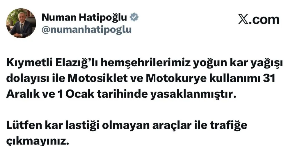 Elazığ Valiliği ve ilgili birimler tarafından alınan karar doğrultusunda, 31 Aralık ve 1 Ocak tarihlerini kapsayan iki gün boyunca motosiklet kullanımı durduruldu. Alınan tedbirin, özellikle buzlanma ve don riskine karşı önleyici bir uygulama olduğu belirtildi.