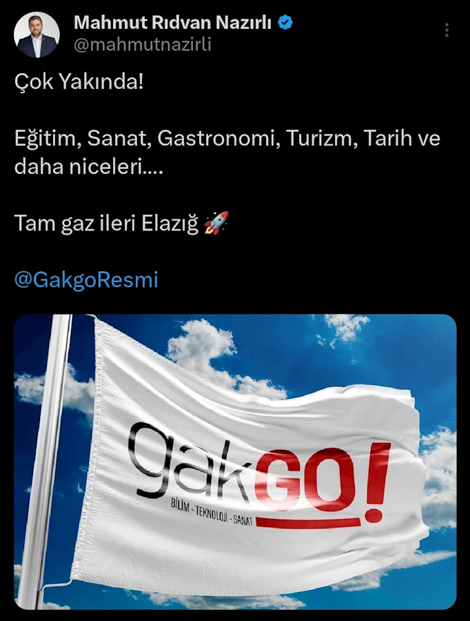 Elazığ Milletvekili Mahmut Rıdvan Nazırlı, Elazığ’ın kültürel zenginliğini ortaya çıkarmayı ve sosyal yapısını güçlendirmeyi hedefleyen yepyeni bir projeyi duyurdu. “Çok Yakında! Eğitim, Sanat, Gastronomi, Turizm, Tarih ve daha niceleri…. Tam gaz ileri Elazığ.” mesajıyla duyurulan “gakGO!” Projesi şimdiden şehirde büyük heyecan yarattı.