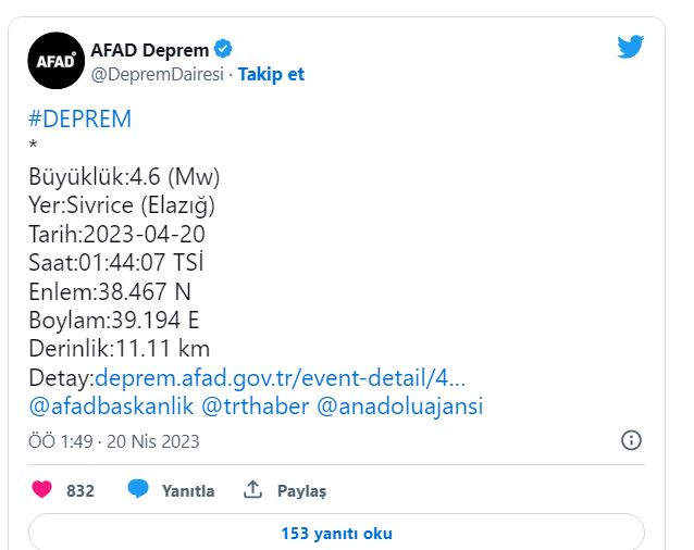 Afet ve Acil Durum Yönetimi Başkanlığı (AFAD) Deprem Dairesi Başkanlığından alınan bilgiye göre, 01.44'te merkez üssü Elazığ'ın Sivrice ilçesi olan 4.6 büyüklüğünde deprem meydana geldi. Yerin yaklaşık 11.11 kilometre derinliğinde meydana gelen deprem çevre ilçelerden de hissedildi.