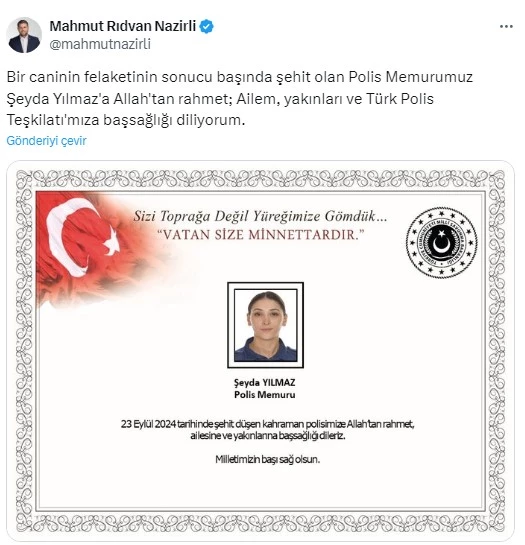 AK Parti Elazığ Milletvekili Mahmut Rıdvan Nazırlı, polis memuru Şeyda Yılmaz’ın şehit edilmesi üzerine duyduğu üzüntüyü dile getirdi. Nazırlı, "Bir caninin felaketinin sonucu başında şehit olan Polis Memurumuz Şeyda Yılmaz'a Allah'tan rahmet; ailem, yakınları ve Türk Polis Teşkilatı'mıza başsağlığı diliyorum" dedi.