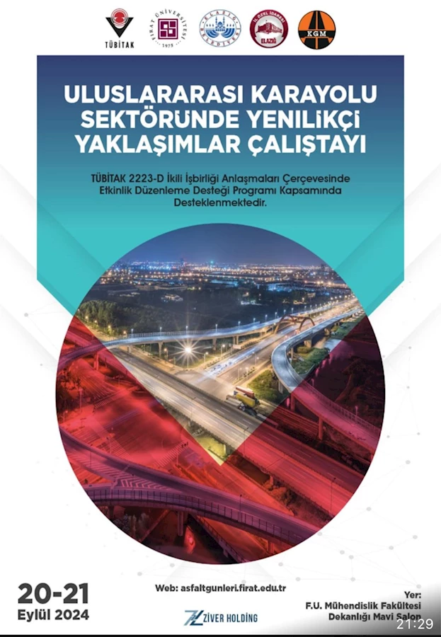 Elazığ’da, Fırat Üniversitesi, Elazığ Belediyesi, Elazığ İl Özel İdaresi ve Karayolları Genel Müdürlüğü işbirliğiyle düzenlenen "Uluslararası Karayolu Sektöründe Yenilikçi Yaklaşımlar Çalıştayı" büyük ilgi gördü. TÜBİTAK 2223-D ikili işbirliği anlaşmaları kapsamında sağlanan etkinlik desteğiyle hayata geçirilen çalıştayda, karayolu sektöründeki teknolojik yenilikler ve sürdürülebilir çözümler masaya yatırıldı.