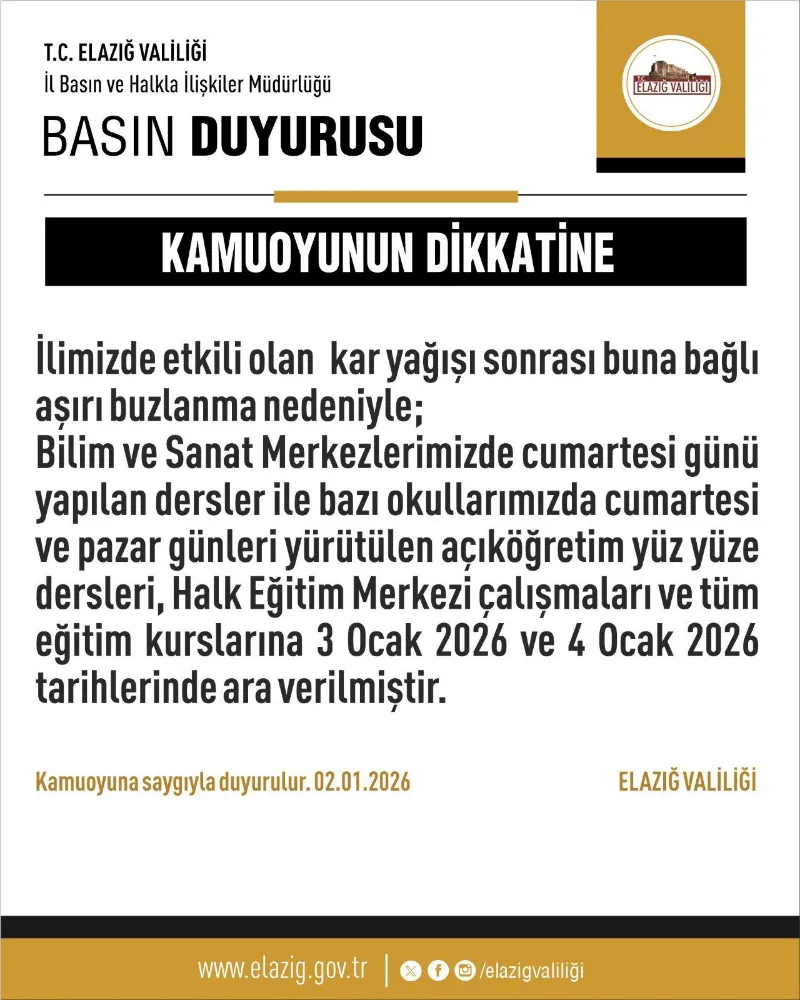 Açıklamada, “İlimizde etkili olan kar yağışı sonrası buna bağlı aşırı buzlanma nedeniyle; Bilim ve Sanat Merkezlerimizde cumartesi günü yapılan dersler ile bazı okullarımızda cumartesi ve pazar günleri yürütülen açıköğretim yüz yüze dersleri, Halk Eğitim Merkezi çalışmaları ve tüm eğitim kurslarına 3 Ocak 2026 ve 4 Ocak 2026 tarihlerinde ara verilmiştir.” ifadelerine yer verildi.