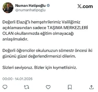 Valilikten yapılan son dakika açıklamasında, Meteoroloji 13. Bölge Müdürlüğü verileri doğrultusunda il genelinde aşırı buzlanma ve don riskinin beklendiği belirtilerek, Elazığ İl Merkezi’nde taşımalı eğitim kapsamında yürütülen eğitim-öğretim faaliyetlerine 14 Ocak 2026 Çarşamba günü 1 gün süreyle ara verildiği bildirildi.